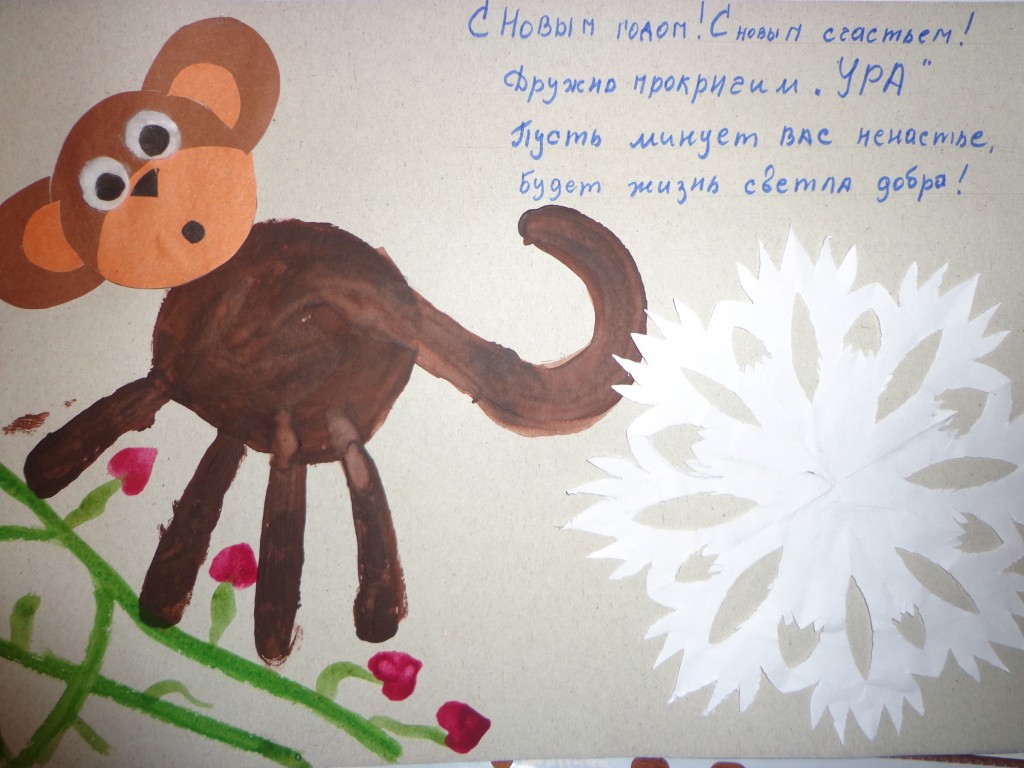 С шуточного вопроса «Ребят, а что у вас на носу?», ответ которого был «Новый год» начала свое творческое занятие «Мы весёлые мартышки» воспитатель ГКП «Теремок» и ГКП «Непоседы» Шупикова А.Е. посвященное символу наступающего года – обезьянке. Занятие прошло в игровой форме, на котором дети с удовольствием попрыгали, поиграли, показали повадки обезьянок, и даже покривлялись, как это делает символ наступающего года. Затем воспитатель провела с детьми мастер-класс «Рисование обезьянки из отпечатка ладони». Не остались в стороне и родители воспитанников, совместно с детьми родители изготовили на районный семейно-детский конкурс новогодние открытки.