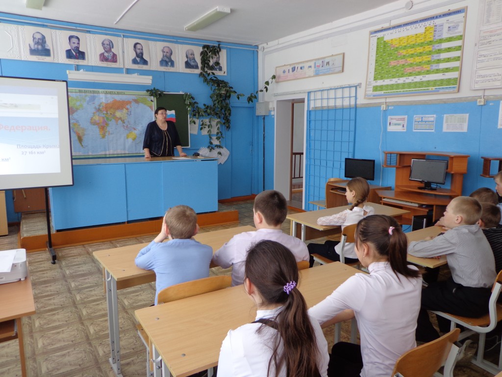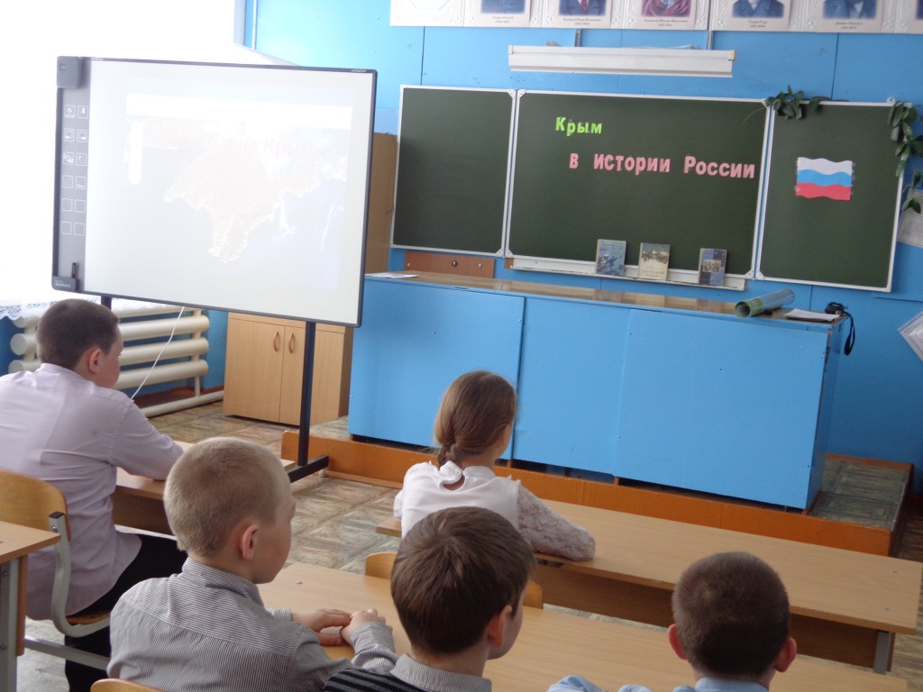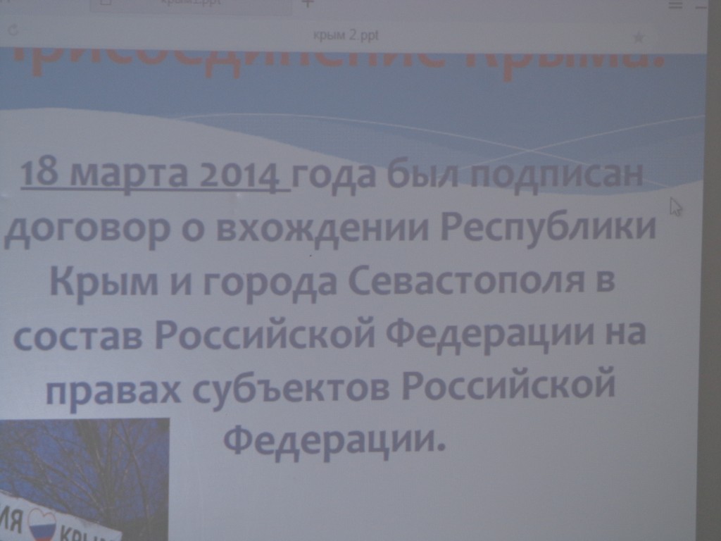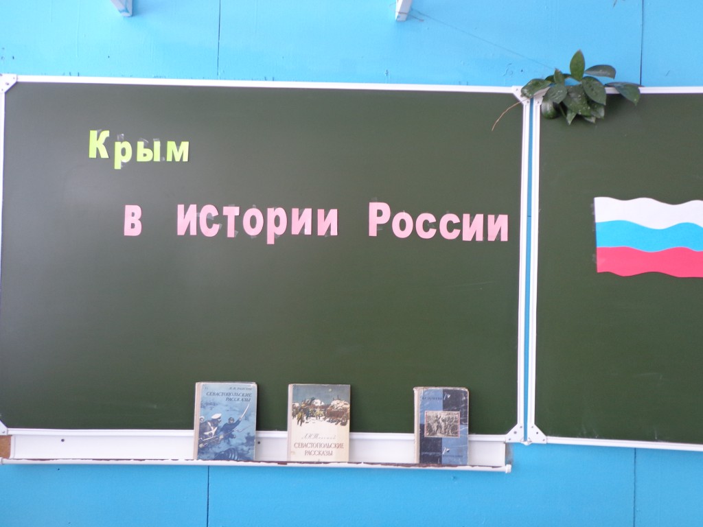 18 марта учителями истории и русского языка и литературы был проведен урок «Крым в истории России». Учитель истории Матаева Л.А. познакомила учащихся 5-9 классов с историческими аспектами и предпосылками вхождения Крыма и Севастополя в Россию. Ребята узнали о том, как был заселен полуостров, как на протяжении многих веков и тысячелетий древности земля Крыма пережила множество переселений и завоеваний. Ребята вспомнили, где на географической карте расположен полуостров Крым. Учитель русского языка и литературы Матаева Л.Г. познакомила детей с тем, что полуостров неразрывно связан с эпохами Золотого и Серебряного веков русской культуры. Представила вниманию учащихся книгу Л.Н.Толстого, принимавшего участие в обороне Севастополя «Севастопольские рассказы». При помощи презентации Людмила Георгиевна рассказала учащимся о последовательности событий передачи Крыма Украине в 1954 году до вхождения Республики Крым и города Севастополя в состав Российской федерации на правах субъектов Российской федерации в 2014 году. О перспективах развития полуострова.