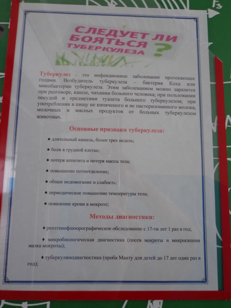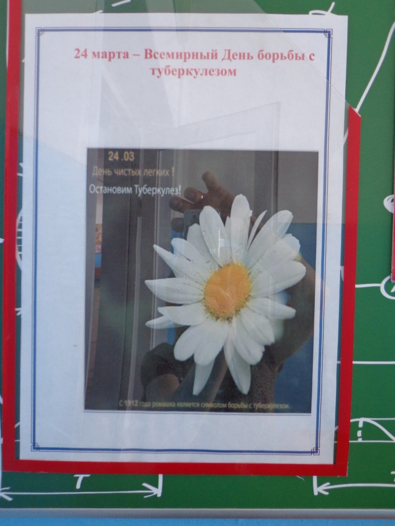 24 марта волонтеры школы и социальный педагог Абуталипова Н. А. провели акцию «Белая ромашка-символ жизни» посвященную Всемирному дню борьбы с туберкулезом. Ребята провели анкетирование среди учащихся школы «Что ты знаешь о туберкулезе?». Из анкет выяснилось, что учащиеся знают что вызывает туберкулез, пути передачи болезни, как выявить заболевания и меры профилактики. Был оформлен стенд посвященный Всемирному дню борьбы с туберкулезом.