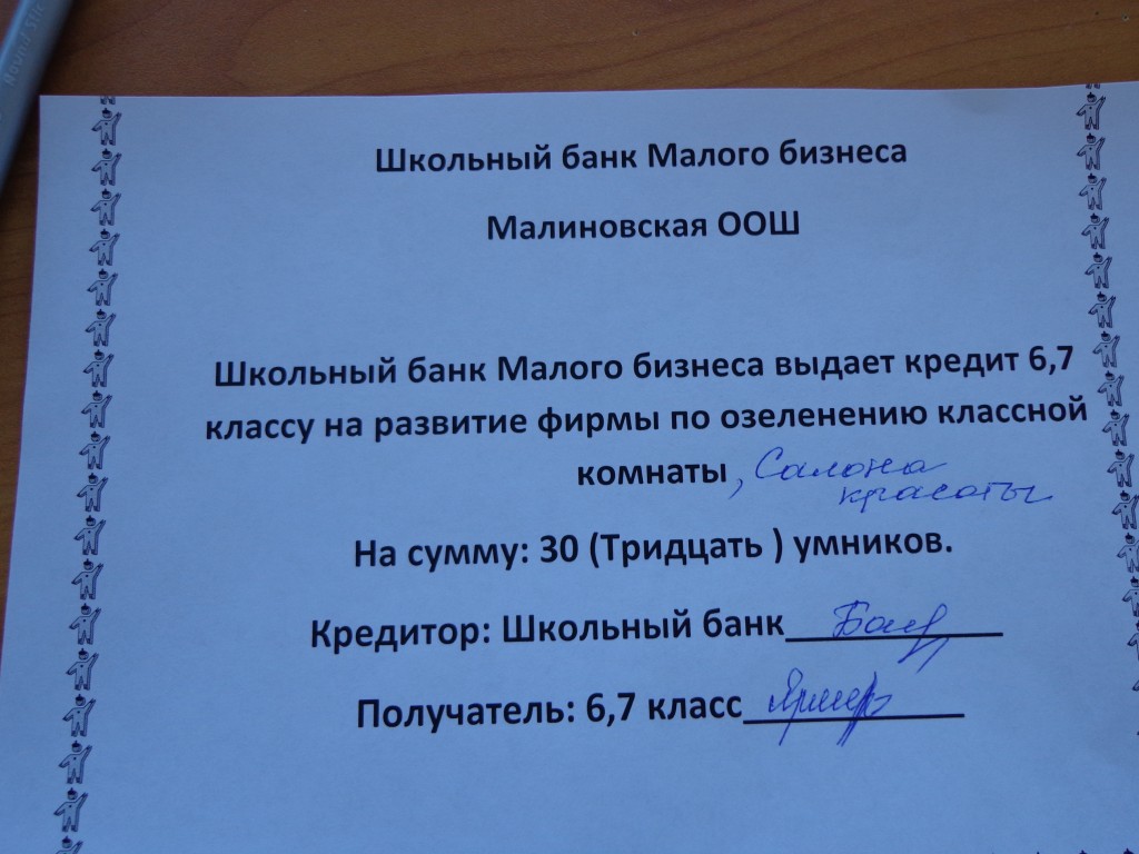 9 сентября в школе в рамках «свободных пятниц» прошла деловая игра «Я-предприниматель». Были организованы фирмы: по озеленению классных комнат, Салон красоты, фитнес-клуб «Здоровье». Перед открытием салонов каждая фирма получила кредиты в школьном банке (школьная валюта – Умник). В заключении игры директор каждой фирмы предоставил отчет по расходам и доходам. Лучшим предпринимателям вручены медали «Лучший школьный предприниматель».
