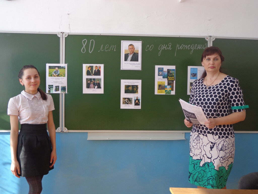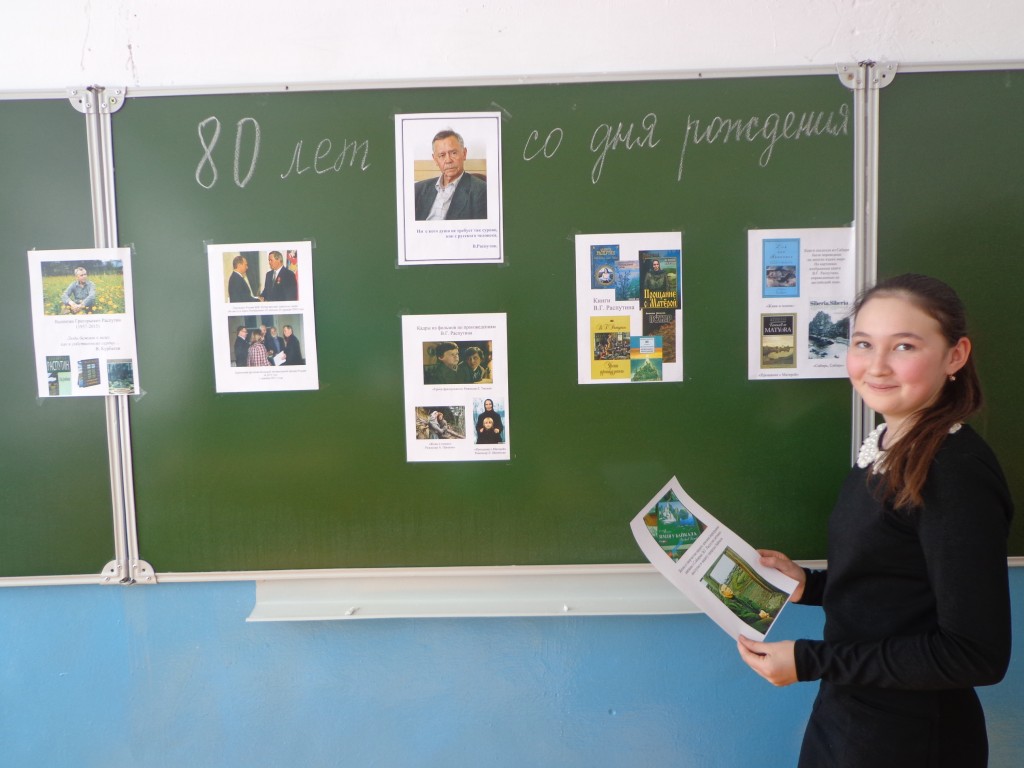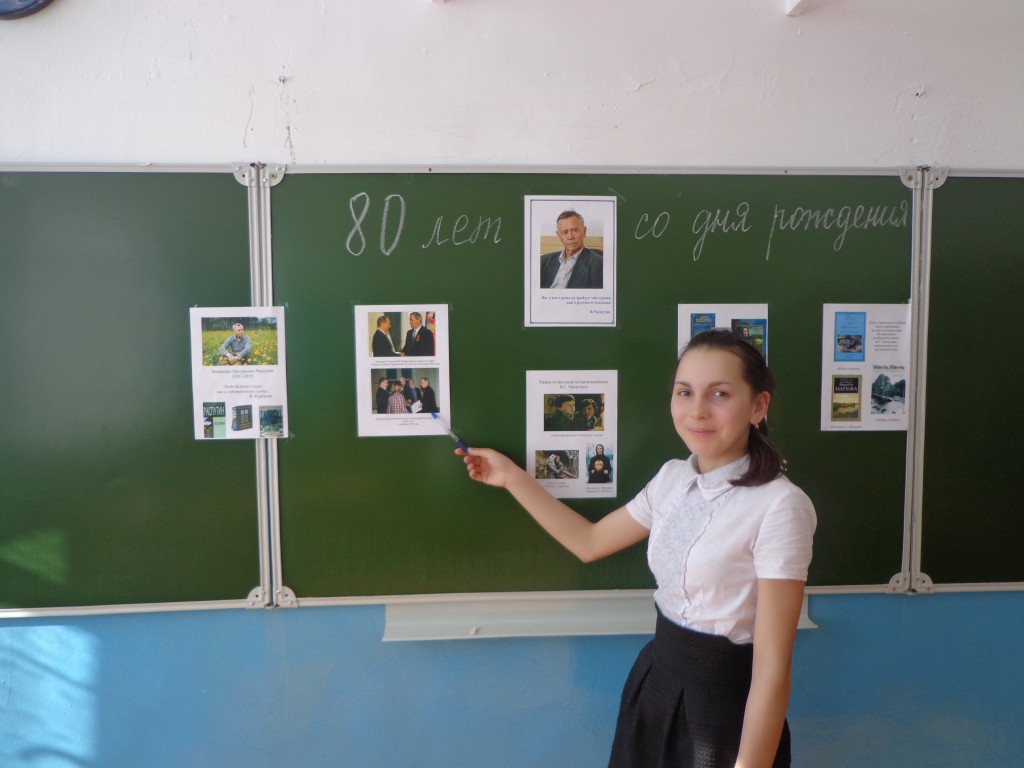 15 марта исполнилось 80 лет со дня рождения В.Г.Распутина. Учитель русского языка и литературы Матаева Л.Г. провела в 7 классе «Урок совести и правды». Целью, которого было продолжить знакомство с творчеством В.Г.Распутина; ввести ребят в духовный мир писателя, в нравственный мир его героев. Ребята познакомились с разными книгами мастера слова, посмотрели кадры из фильма по его произведению «Уроки французского». Ученики прочитали стихи поэтов, посвященные В.Г.Распутину.
